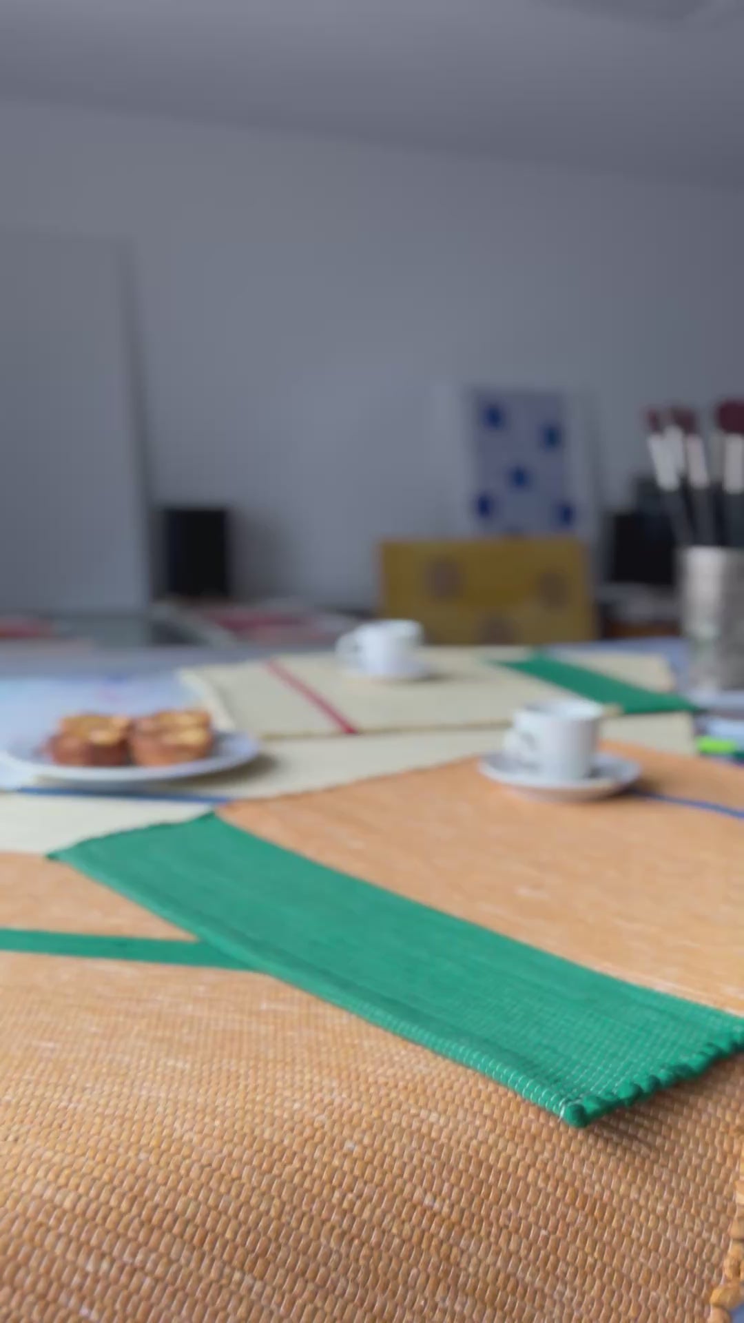 Komposition für den gedeckten Tisch: Vier handgewebte Tischsets und ein Tischläufer, die Günter Malchows künstlerische Vision in tragbare Textilkunst verwandeln. Inspiriert von seinen reduzierten Arbeiten der 1990er Jahre, entstehen die Stücke auf traditionellen Holzwebstühlen in Nordportugal – jedes ein Unikat. Die upgecycelten Materialien aus der Textilindustrie lassen die Sets nicht nur ressourcenschonend herstellen, sondern geben Ihnen auch individuelle Textur. Eine Spezial-Artist-Kollektion, die handwerkliche Tradition mit zeitgenössischer Kunst verbindet.